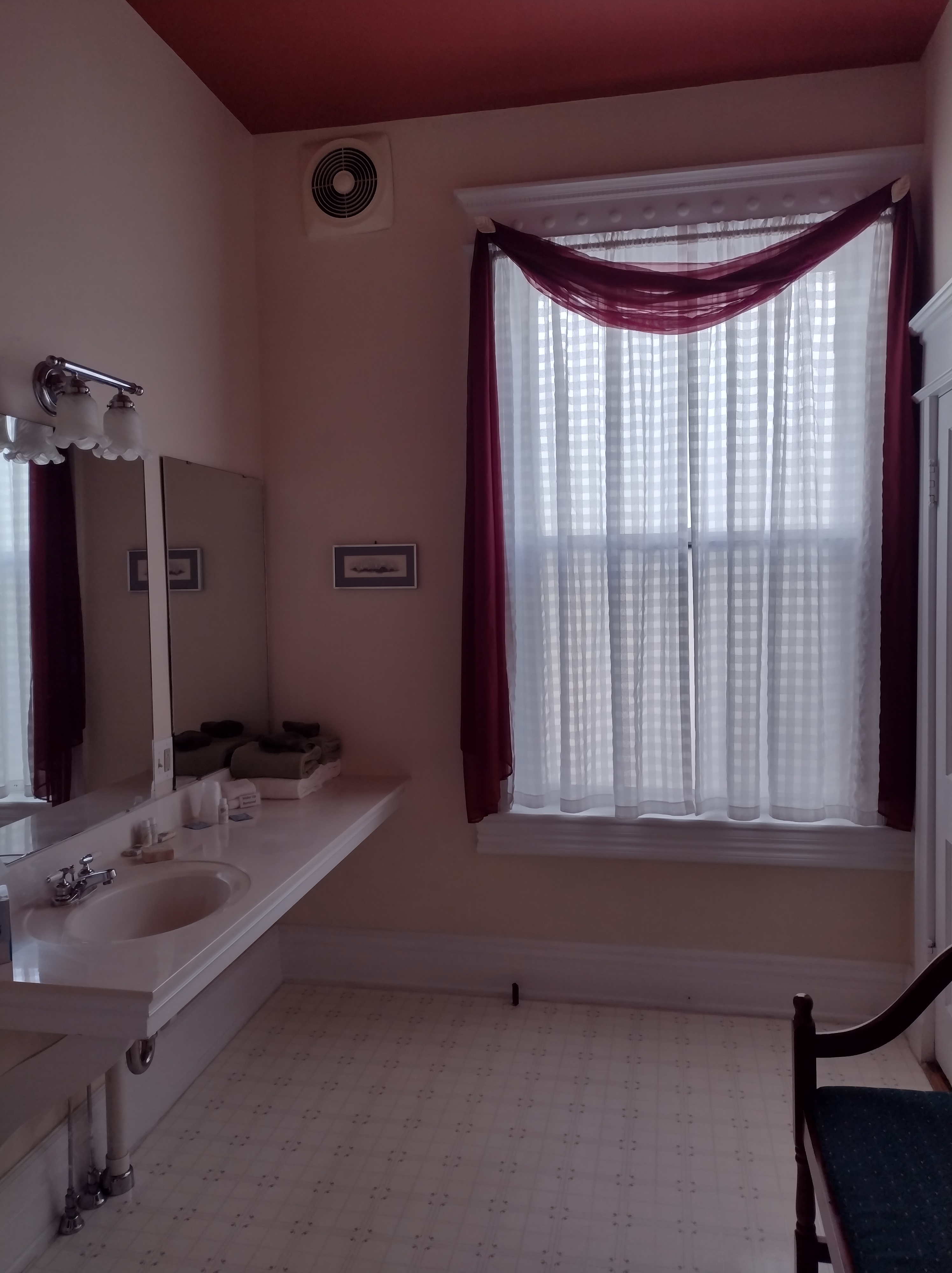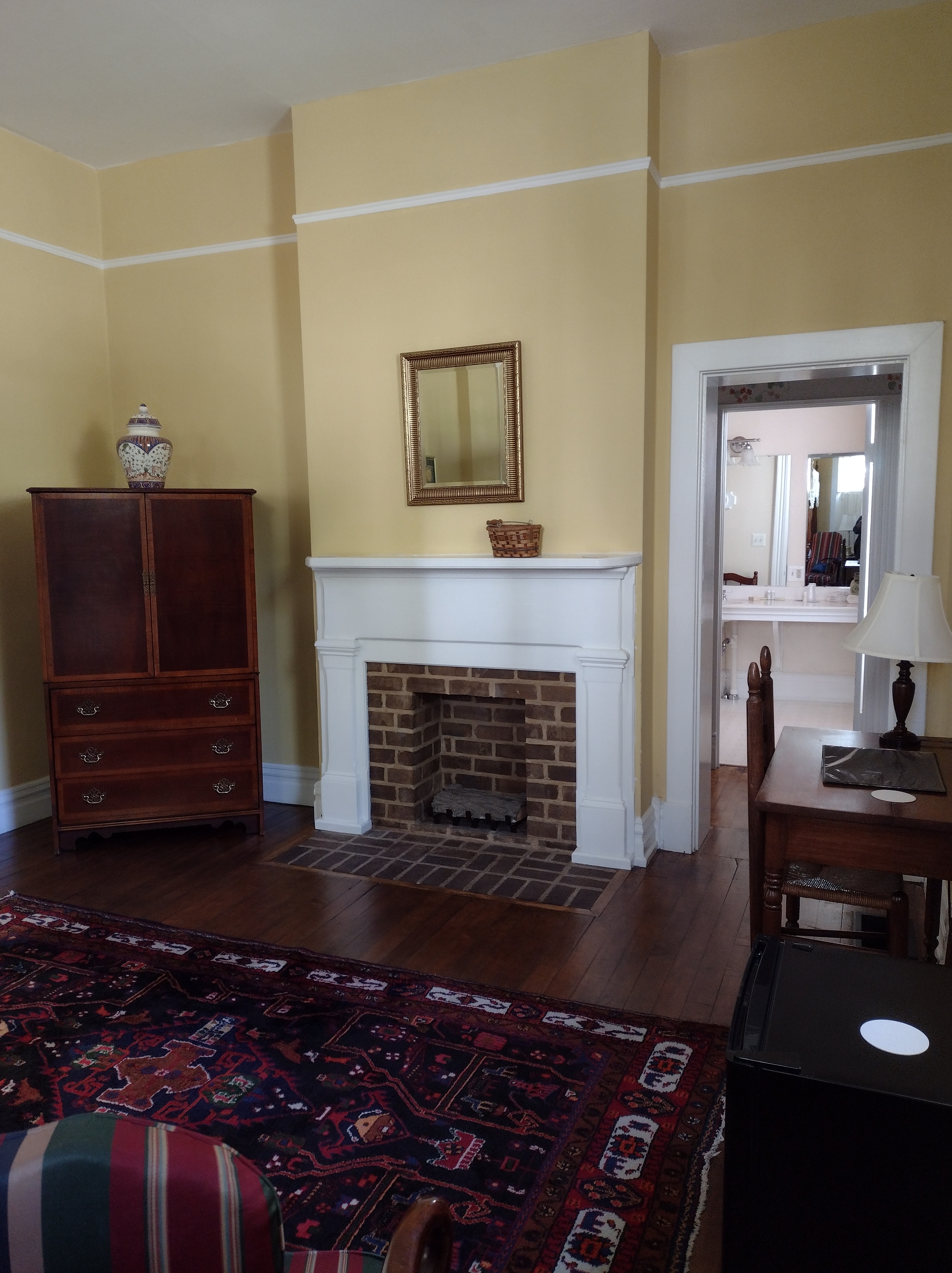Queen room on the first floor of the Patrick House. Lots of space. Beautiful, comfortable canopy bed. Large en suite bathroom with shower. The bathroom is believed to have been the original detached kitchen from when the house was built in the 1840s. In the 1890s’ when the facade was rotated to face New Street and the Victorian look was designed, the kitchen was attached to the house. One of the best values per square foot. Being on the first floor it offers easy access from Patrick House’s private driveway. Occupancy 2.